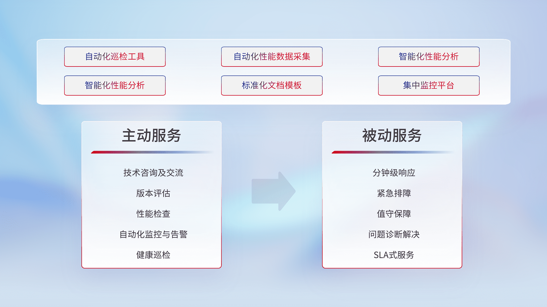 智能化工具和标准化文档,,保障服务质量,,,提供主动服务(包含技术咨询、、、、版本评估、、性能检查、、、、自动化监控与告警、、、、健康巡检)和被动服务包含(分钟级响应、、紧急排障、、值守保障、、、、问题诊断解决、、、SLA服务)。。